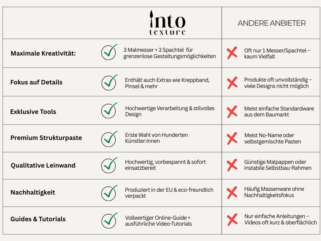 Das normale Starter-Set enthält einen Keilrahmen und eine Strukturpaste, während das Duo-Set mit zwei Keilrahmen und zwei Pastenideal fürDuo-Motive, Date Nights oder kreative Sessions zu zweit ist.